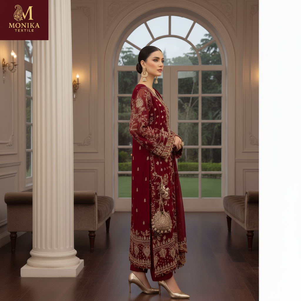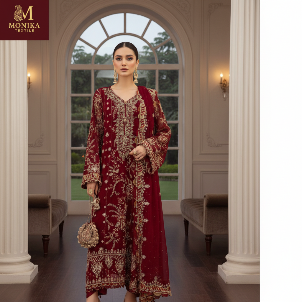 Step into the spotlight with our latest Semi-Pure Chiffon masterpiece. Featuring intricate Spengle work and handcrafted Adda details, this outfit is designed to make heads turn this wedding season.