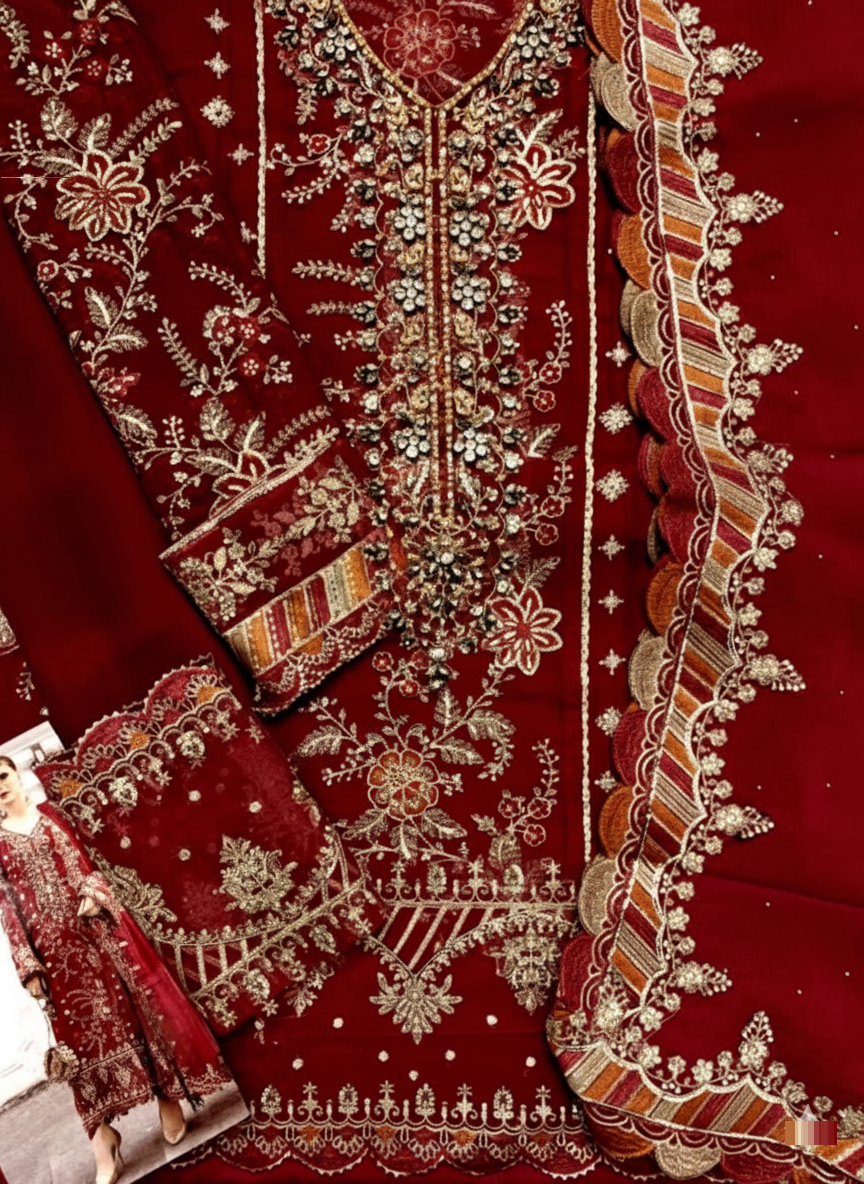 Dupatta: Chiffon with delicate spray embellishment and a 4-side heavy sequence embroidered Spengle work border (fully attached).