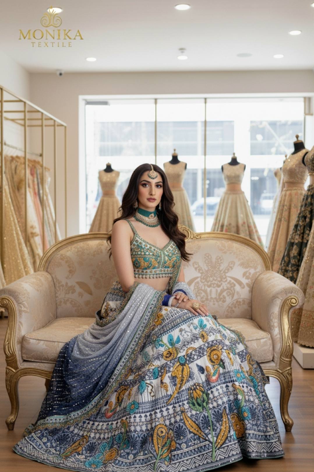 Sway into the spotlight with this breathtaking creation by Monika Textile. Crafted on luxurious Shamose Silk, this lehenga is designed to make an entrance!